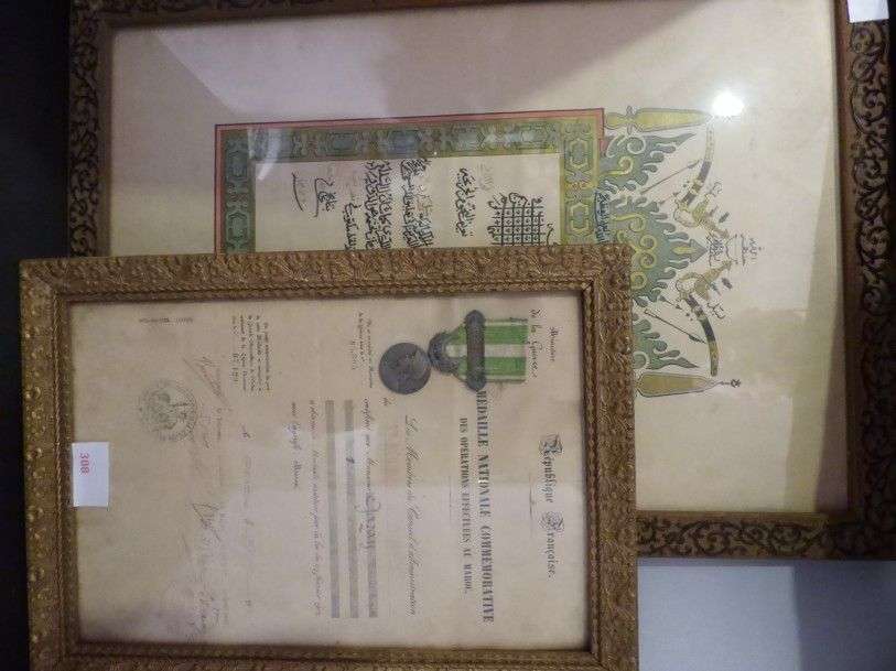 Lot de 2 diplômes: Ordre de l'Étoile Royale de la Grande Comore, au nom de Jules Daire. Tananarive le 7 août 1911. Avec sa traduction| Médaille commémorative des opérations effectuées au Maroc, au nom de Gazay Marius, Zouave de 1ère Classe, au 3me Régiment de Zouaves. A Constantine le 25 février 1913. Avec décoration. On joint un velours vert, brodé jonquille «Infanterie Coloniale, 1892-1908, Algérie, Île de Crête, Île de la Réunion, Cochinchine, Madagascar, Soudan».