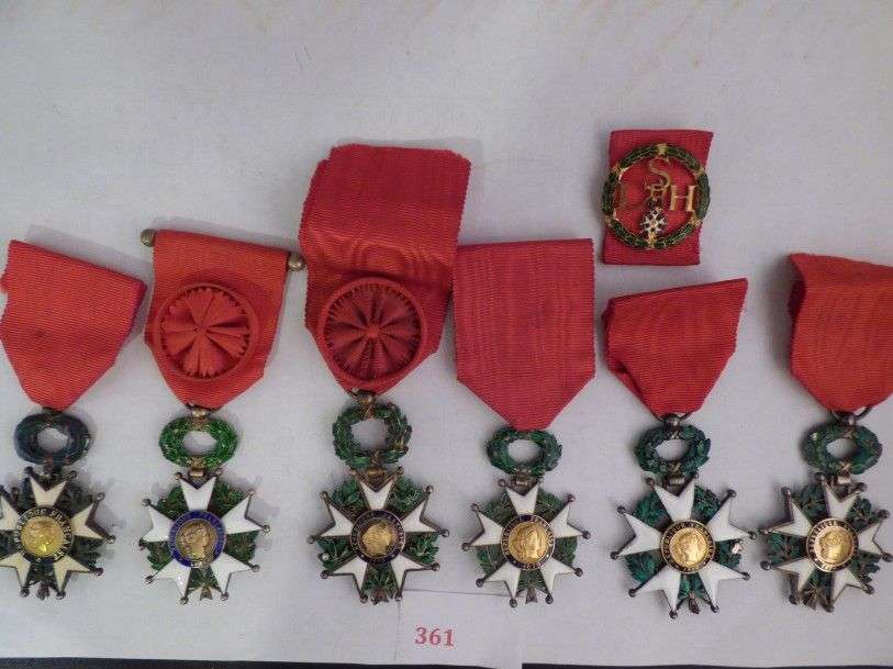 Lot de 6 étoiles: 2 d'Officier en vermeil, 3 de Chevalier, IIIè République, 1 Chevalier Vè République. émail (éclats), rubans. On joint un insigne de la Légion d'honneur.