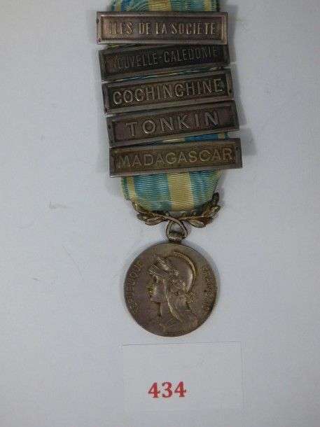 Argent, rubans, 5 agrafes à clapet Île de la Société, Nouvelle Calédonie, Cochinchine, Tonkin, Madagascar.