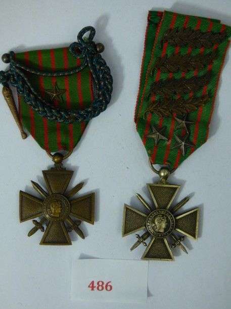 Lot de 2 médailles. Vermeil, bronze, rubans, 2 mini-fourragères.