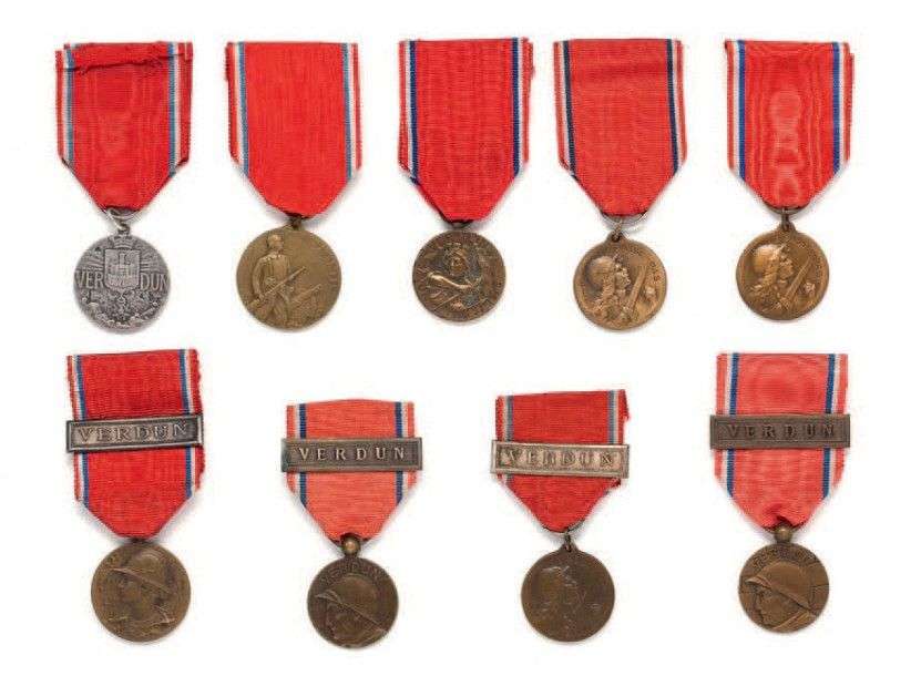 Lot de 9 médailles, modèle différents. Bronze, rubans, 4 agrafes Verdun.