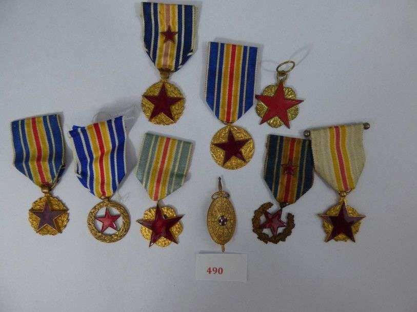 Lot de 9 médailles, modèle différents. Bronze doré, émail, rubans.