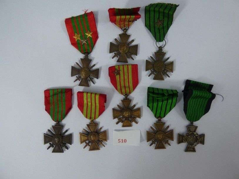 Lot de 7 médailles, millésimes différents, 1 copie LVF. Bronze, rubans.