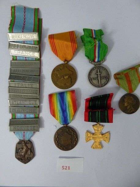 Lot de 6 médailles: Commémorative avec 13 agrafes, Réfractaire, France libérée, Ancien combattant, Résistance volontaire, Engagé volontaire.