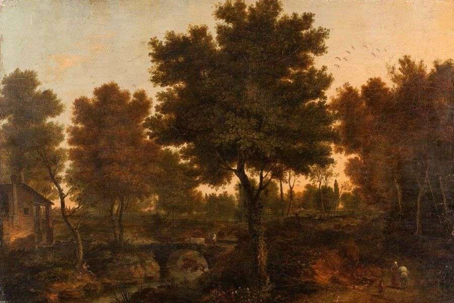 Paysage de forêt avec une chaumière et un joueur de flute