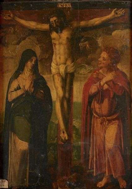 Christ en croix avec la Vierge et saint Jean Baptiste Panneau de sapin 47 x 33 cm (soulèvements)(*)