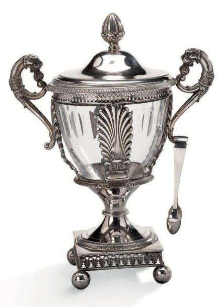 Sucrier en argent posant sur un socle à décor ajouré de palmettes, le pied circulaire souligné de feuilles d'eau, motifs repris sur les cols de la monture. Anses à volutes et gueules de félins. Poignée du couvercle en forme de gland. Doublure en verre.