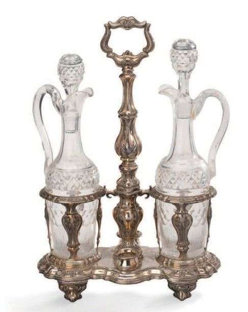 Huilier-vinaigrier à monture en argent de forme chantournée et à motifs rocailles et feuillagés. Carafons en verre taillé à décor de pointes de diamant.