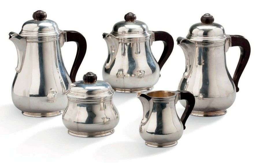 Service à thé et café en argent, cinq pièces à corps pansu et bombé, souli