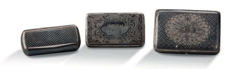 Trois petites boîtes en argent étranger ciselé et niellé.