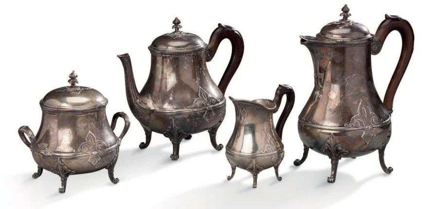 Beau service à thé et café en argent de quatre pièces à corps pansus soulignés de motifs stylisés et posant sur quatre pieds à attaches feuillagés, motifs repris sur les poignées en bois et les couvercles. Intérieurs en vermeil.