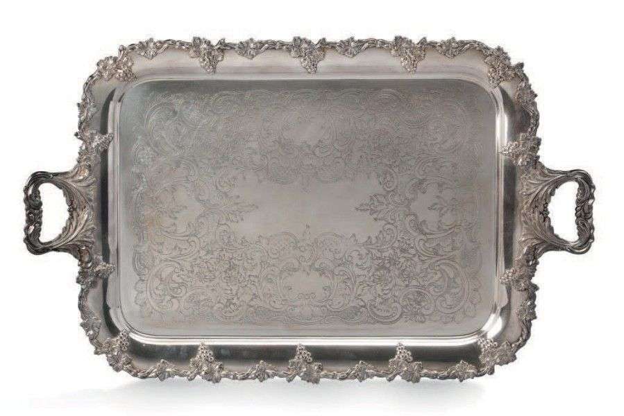 Deux grands plateaux de service rectangulaire à anses en métal argenté richement gravé et orné de motifs divers, grappe de raisins arabesque.