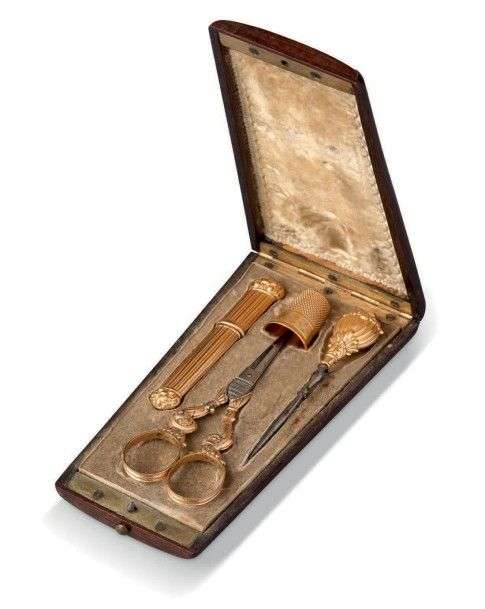 Nécessaire à couture en or jaune 18k et métal dans son écrin.