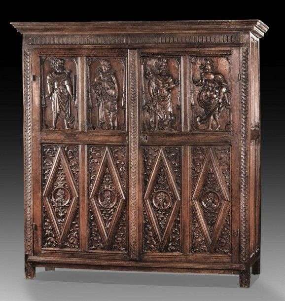 Belle armoire en chêne sculpté ouvrant à deux portes. Les montants sculptés de chutes de lambrequins, les côtés des panneaux à plis de serviettes. Les portes sculptées de motifs losangés sur fond de rinceaux et centré de médaillons à profils masculins. Dans le haut quatre personnages allégoriques sculptés en bas relief.