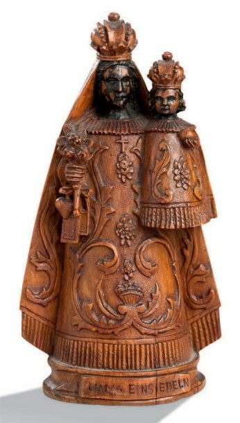 Elle tient le christ de la main gauche et de l'autre un bouquet de fleurs.