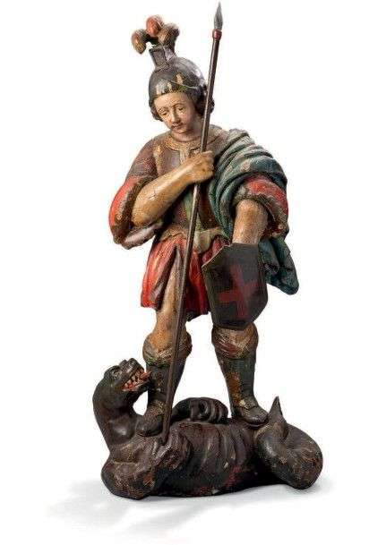 «Saint Michel terrassant le Dragon» statue en bois polychromé et doré.