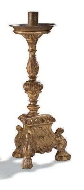 Paire de piques cierge en bois sculpté, stuqué et doré. Base tripode ornée