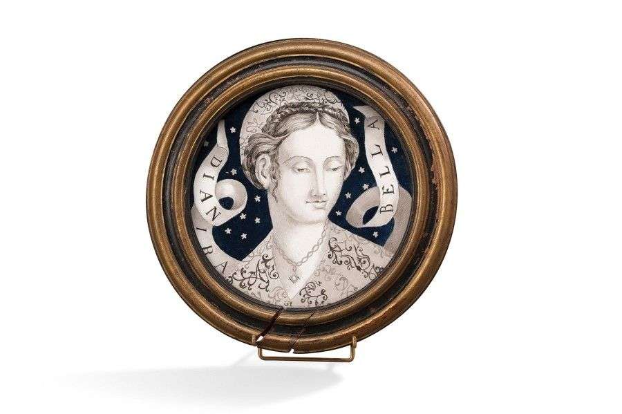 Plat en en céramique figurant un portrait de femme en grisaille sur fond bleu. Inscription "Dianira Bella".