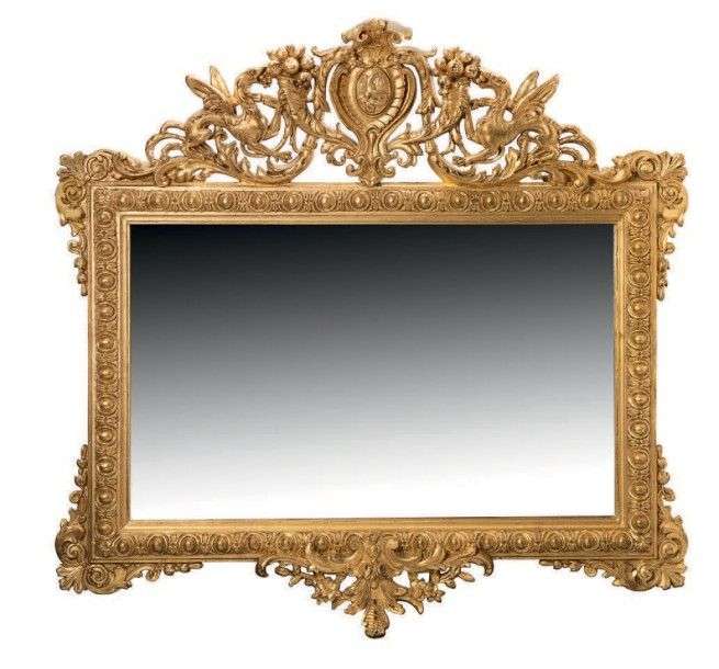Miroir à fronton et cul de lampe ajourés en bois mouluré, sculpté, stuqué et redoré, le fronton à décor d'un cartouche central épaulé de cornes d'abondance, de dragons et volutes.