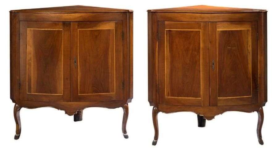Paire d'encoignures en prunier incrusté de bois clair, elles ouvrent par d