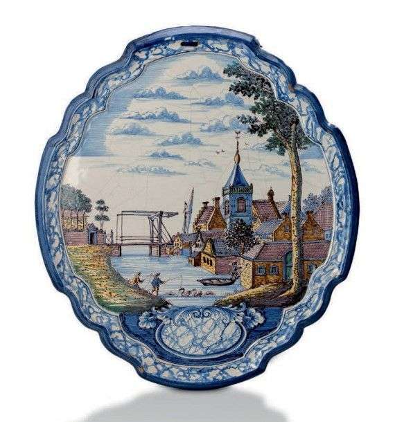 La partie inférieure présente une réserve en camaieu bleu l'autre représente une scène de village et pêcheurs.