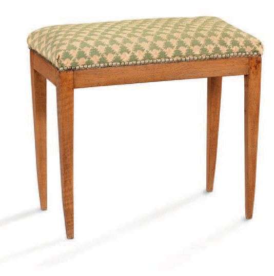 Petit tabouret rectangulaire en bois naturel reposant sur des pieds fuselés à pans.
