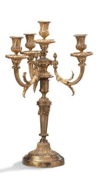 Paire de candélabres en bronze ciselé et doré, à quatre bras de lumière arqués feuillagés| fût à cannelures et guirlandes fleuries, base à canaux rudentés et feuilles d'acanthe.