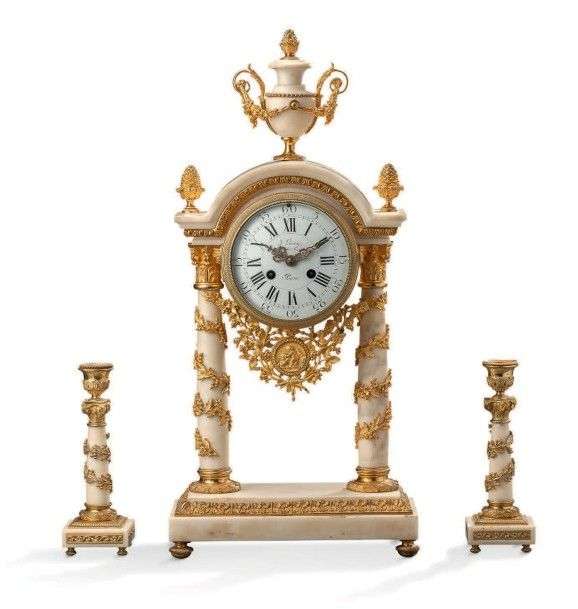 Garniture de cheminée en marbre blanc et bronze ciselé et doré, comprenant une pendule portique et une paire de bougeoirs.