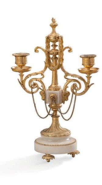 Paire de bougeoirs en bronze doré et ciselé à deux bras de lumières à décor d'enroulements feuillagés et guirlandes fleuries.