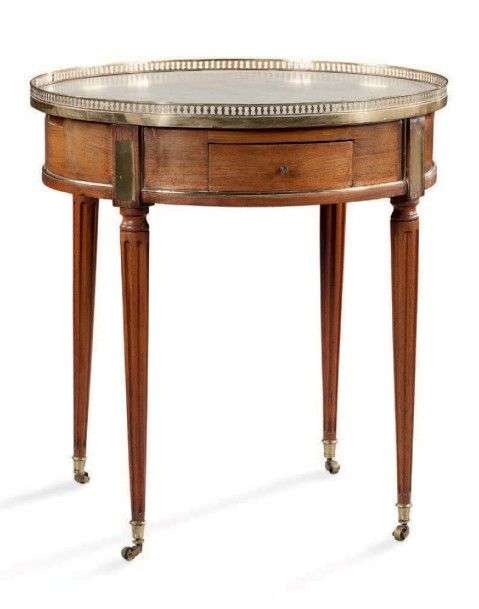 Table bouillotte en acajou à deux tirettes et deux tiroirs latéraux reposants sur quatre pieds fuselés cannelés terminés par des sabots à roulettes en bronze doré.
