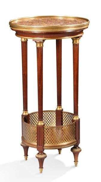 Guéridon en acajou et bronze ciselé et doré| le plateau à larges moulures repose sur quatre pieds à cannelures à bagues réunis par une corbeille ajourée à losanges| petits pieds toupies.