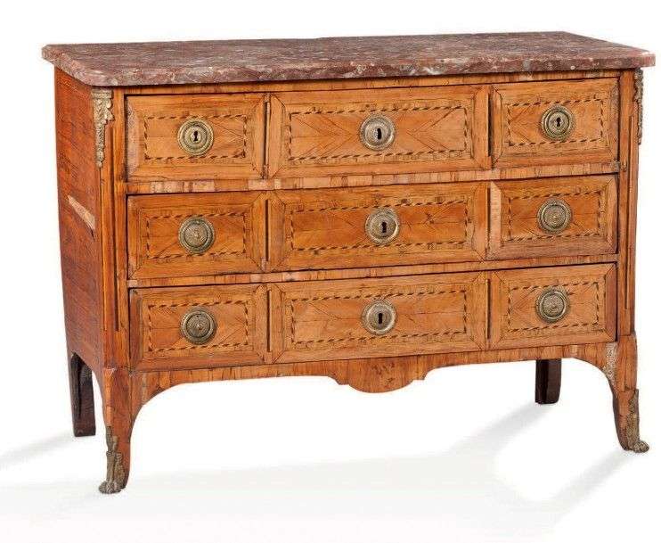 Commode en marqueterie de bois de rose dans des encadrements de bois teint