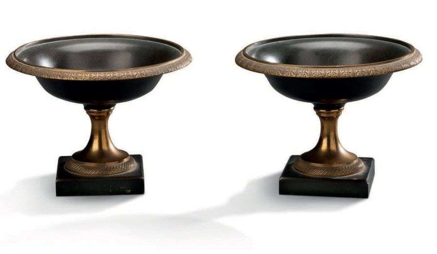 Paire de candélabres en bronze ciselé, doré ou patiné. Le fût formé de vases ovoides sur piedouche, d'ou s'échappent les bras de lumière feuillagés à côtes torses, réunis par des chainettes.