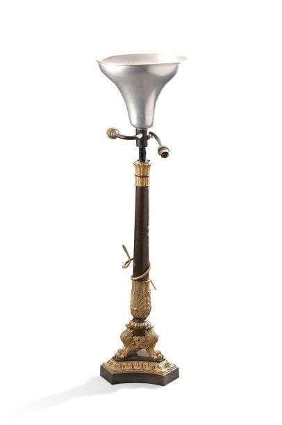 Lampe formée d'un élément de candélabre en bronze ciselé, doré et patiné| le fût cylindrique à palmettes repose sur des pieds griffes.