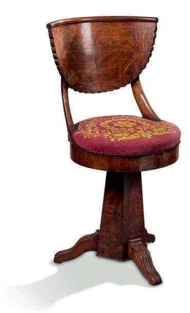 Chaise de harpiste en acajou et placage d'acajou, à dossier en éventail festonné à encadrement de filets clair. Assise ronde garnie de tapisserie au point. Fûts à pans coupés, piètement tripode.