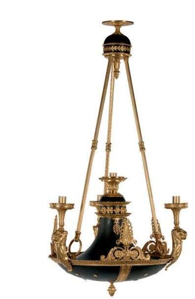 Grand lustre de style Empire en tôle patinée noire et bronze doré, à trois bras de lumières soutenu par des tête lions, le fût enrichi de palmette et surmonté d'une petite coupe ajourée terminé en lumière centrale.