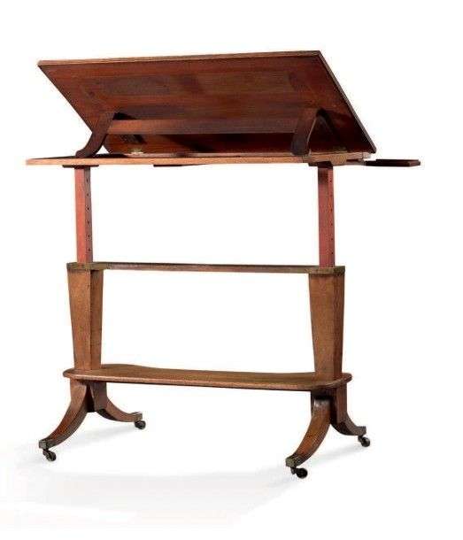 Table écritoire dite à la tronchin en bois naturel à plateau rectangulaire découvrant une petite tablette, elle repose sur deux montants droits reliés par une entretoise se prolongeant sur quatre pieds galbés terminés par des roulettes.