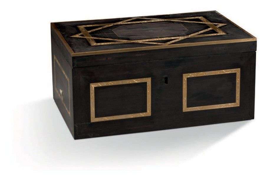 Coffret en placage d'ébène et filets de laiton gravé.