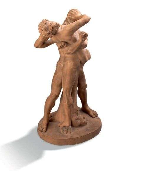 Groupe en terre cuite figurant des lutteurs nus.