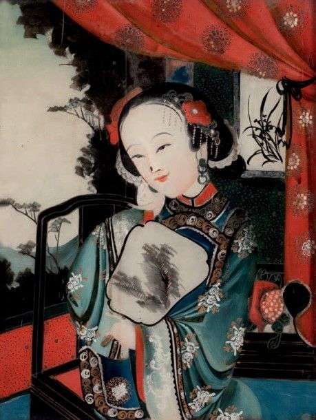 Paire de fixés sous verre représentant des femmes asiatique dans un décor
