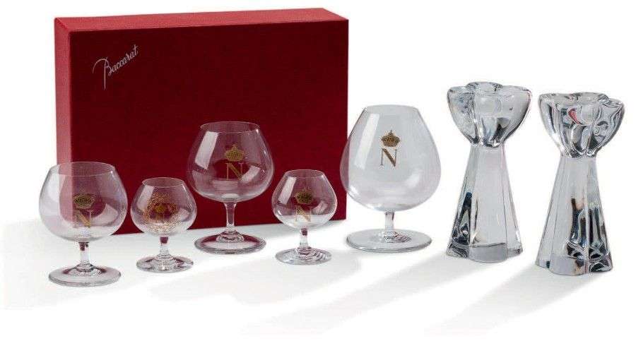 Partie de service au «N» couronné, comprenant 59 verres, dont douze verres à décor gravé et doré du «N» couronné dans un encadrement de feuillages stylisés.