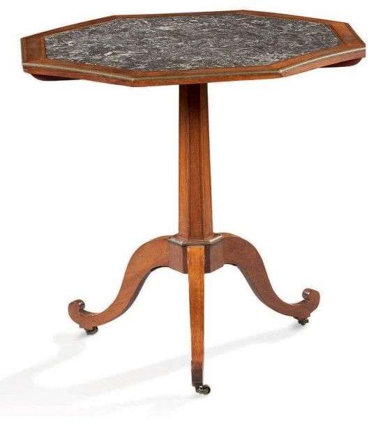 Guéridon à plateau basculant de forme octogonale| en acajou et placage d'acajou, foncé d'un marbre gris veiné blanc.