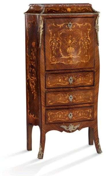 Secrétaire galbé entièrement marqueté en bois de rose et bois de violette, de motifs floraux dans des encadrements à abattant découvrant un intérieur compartimenté en partie haute et de trois tiroirs superposés en partie basse, il repose sur deux pieds galbés à l'avant et de deux pieds droits à l'arrière.
