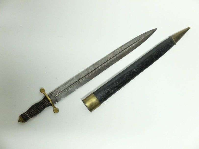 Glaive pour le théâtre. Poignée recouverte de basane avec filigrane. Garde à deux quillons en laiton. Lame à deux tranchants à gouttière centrale. Fourreau recouvert de cuir à couture métallique à deux garnitures en laiton. ABE milieu XIXème siècle