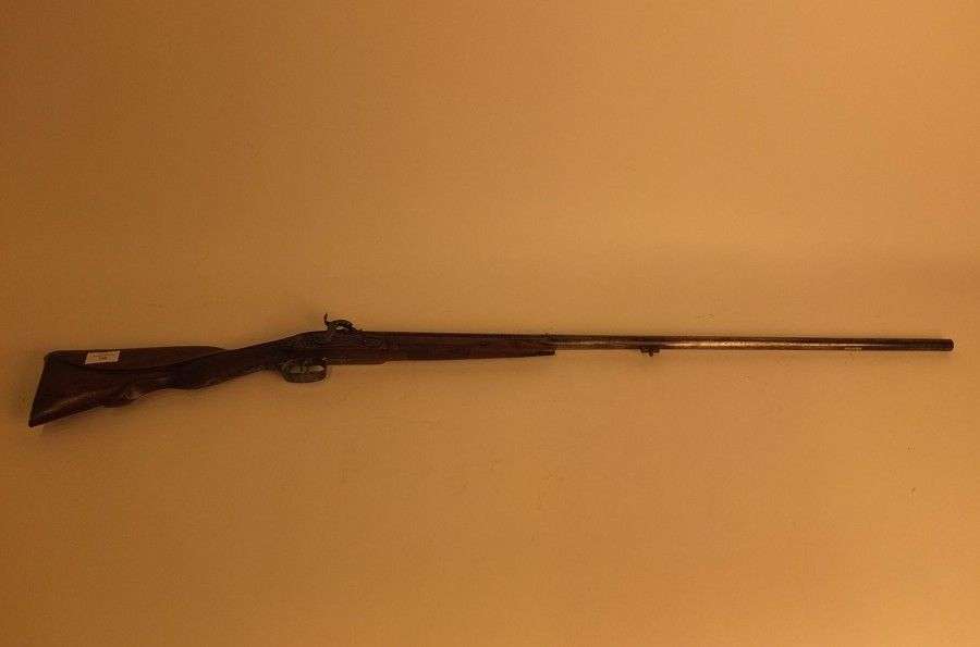 Fusil de chasse, à percussion. Canon rond. Crosse en noyer, sculpté d'un bec de canard. Dans l'état vers 1830