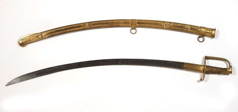 Sabre d'Officier de Cavalerie légère, style Ier Empire. Poignée entièrement filigranée de laiton. Monture en laiton gravé et doré. Calotte à courte queue. Garde à une branche perlée. Lame courbe, à dos plat, contre-tranchant et pans creux, gravée et dorée au talon. Fourreau à deux bracelets à décor ciselé. ABE (coups au fourreau)