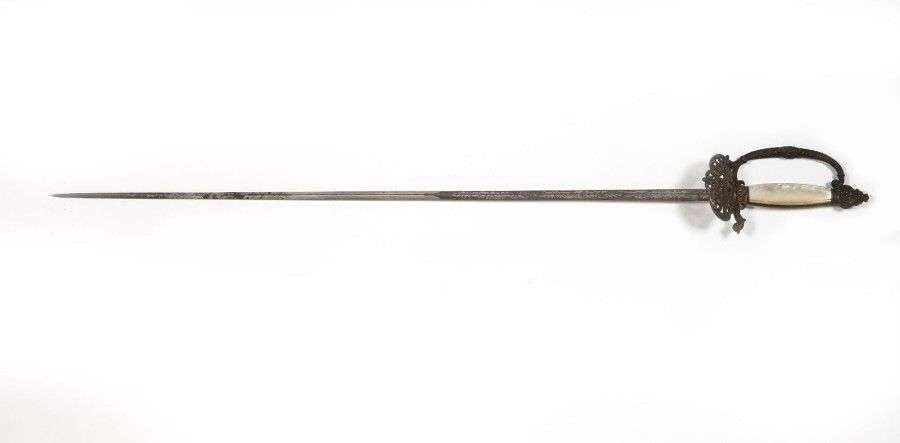 Épée de Cour. Fusée à plaquettes de nacre. Monture en métal ciselé, argenté. Garde à une branche. Clavier à l'Aigle. Lame triangulaire gravée au tiers. ABE SF vers 1860