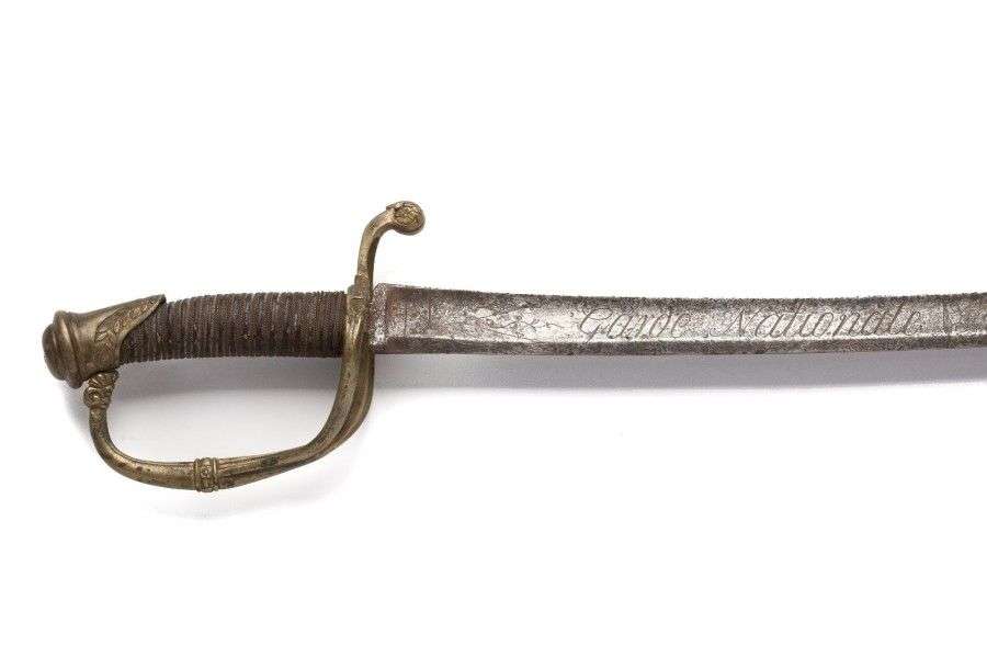 Sabre d'Officier de la Garde nationale, modèle 1821. Poignée recouverte de basane, avec filigrane. Monture en laiton ciselé. Calotte à courte queue. Garde à deux branches. Lame courbe, à dos plat avec marquage, et pans creux, gravée sur des deux faces « Garde nationale » surmonté d'un coq. ME SF vers 1830 (piqûres)