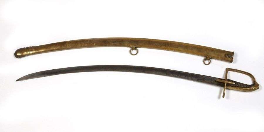 Sabre d'Officier de Cavalerie légère. Poignée recouverte de basane, avec filigrane. Monture en laiton ciselé. Calotte à longue queue. Garde à une branche, à décor perlé et oreillons en baguette. Lame courbe, à dos plat et pans creux, gravée au tiers. Fourreau à deux anneaux en laiton. Dard en fer. EM Époque fin XVIIIè siècle (lame piquée)