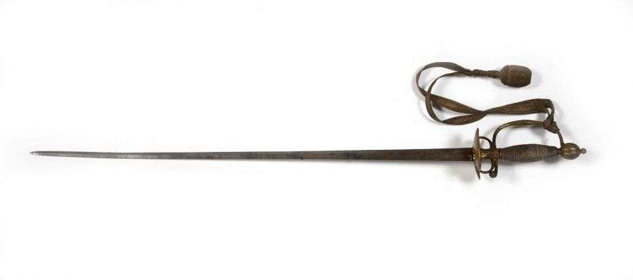 Épée de Cour. Fusée entièrement filigranée de fer. Monture en laiton. Garde à une branche et pas d'âne et coquille bivalves. Lame à deux tranchants à méplat médian, gravée au talon d'entrelacs. EM SF vers 1750 (lame piquée). On joint une dragonne d'Officier Allemand.